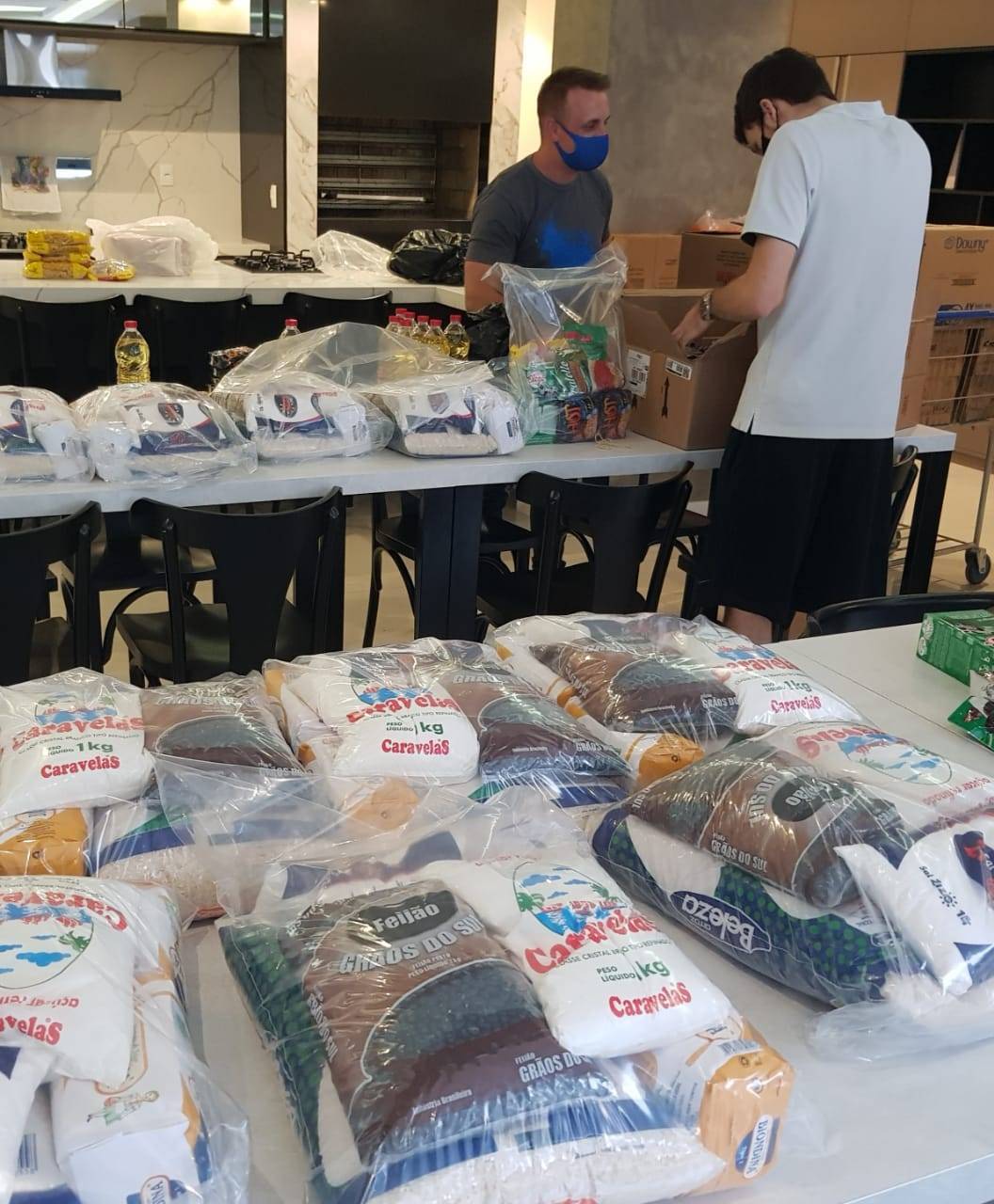Montagem pelos rotarianos e rotaractianos do Planalto Médio das cestas básicas elaboradas especificamente para entrega a comunidade de recicladores do Bairro Bom Jesus.