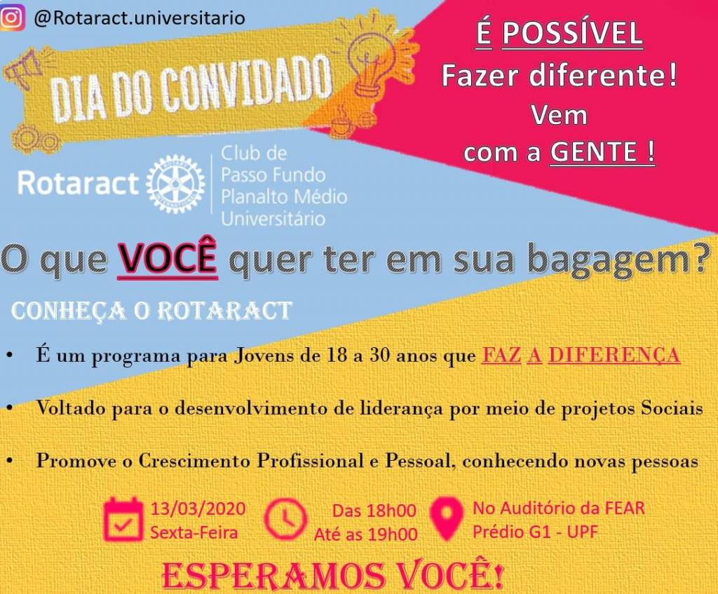 No dia 13/03/2020, realizamos o Dia do Convidado a convite do Rotaract Club de Passo Fundo Planalto Médio Universitário.